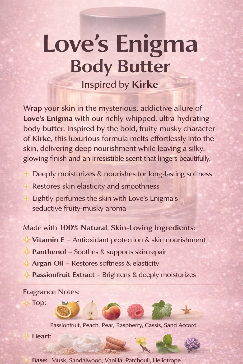 Wrap your skin in the mysterious, sensual allure of Love’s Enigma with our richly whipped, ultra-hydrating body butter. Inspired by the bold, fruity-musky character of Kirke, this luxurious butter blends tropical fruits, soft florals, and warm musky notes to deeply nourish, soften, and smooth the skin while leaving it irresistibly scented.