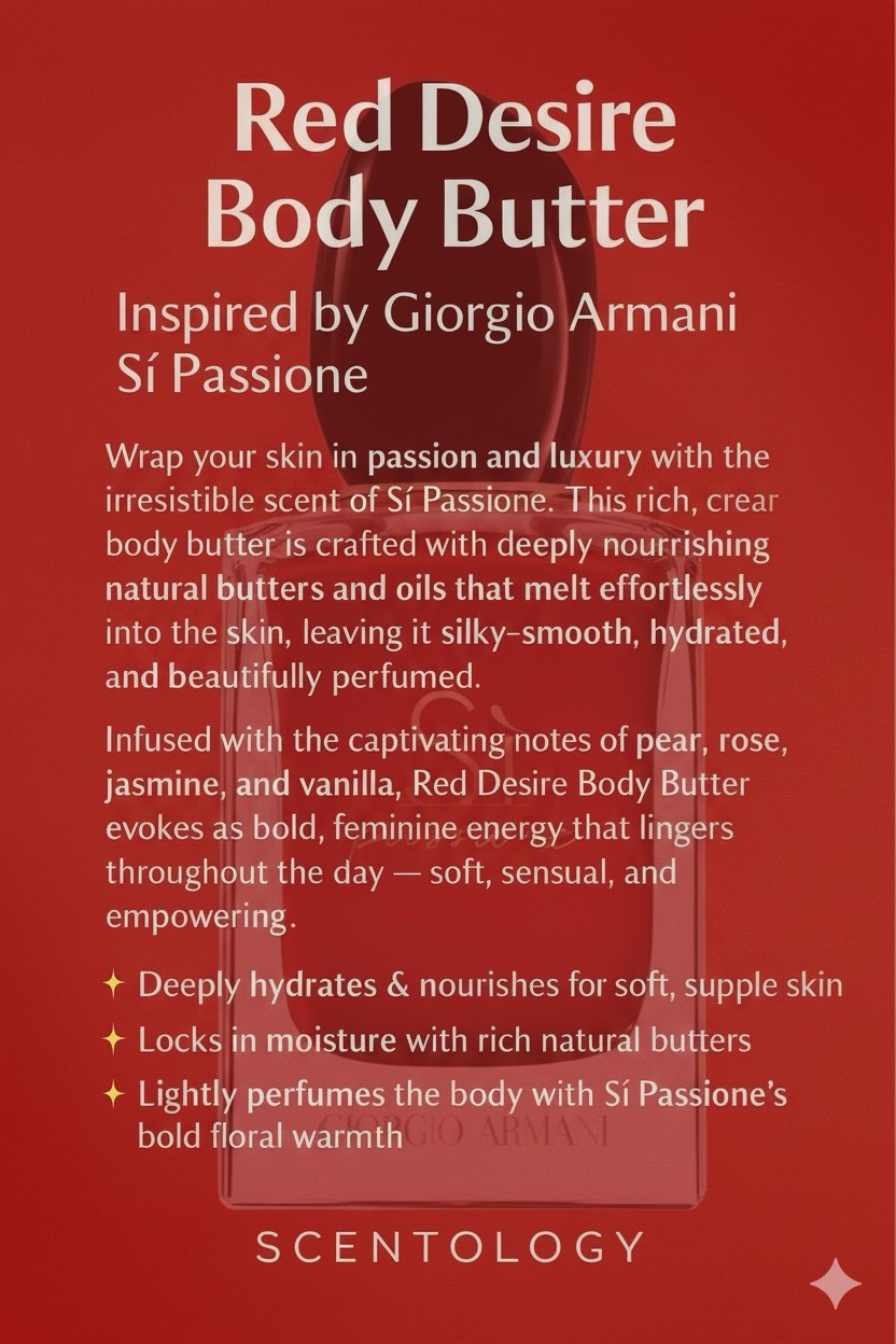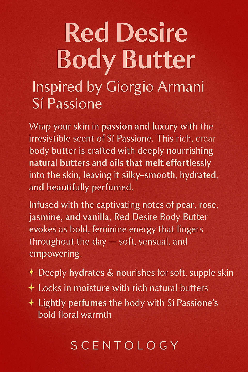 Infused with the captivating notes of pear, rose, jasmine, and vanilla, Red Desire Body Butter evokes a bold, feminine energy that lingers throughout the day — soft, sensual, and empowering.