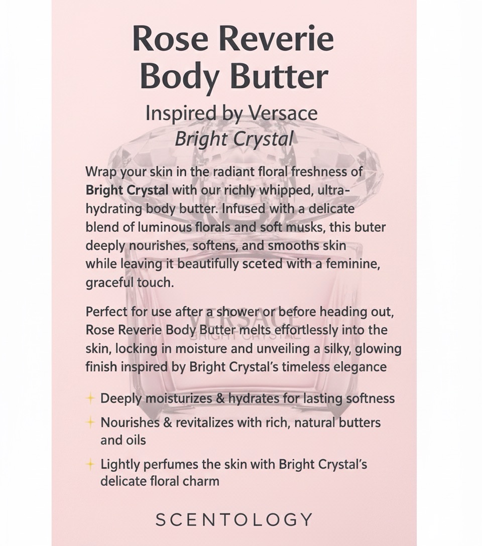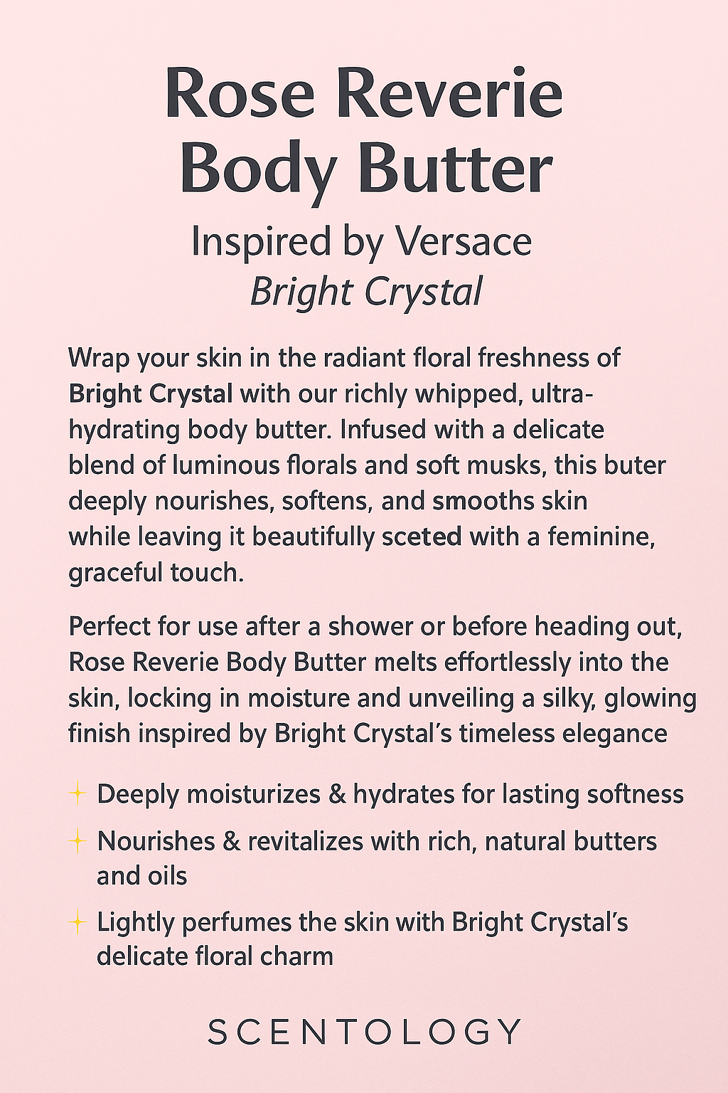 Perfect for use after a shower or before heading out, Rose Reverie Body Butter melts effortlessly into the skin, locking in moisture and unveiling a silky, glowing finish inspired by Bright Crystal’s timeless elegance.