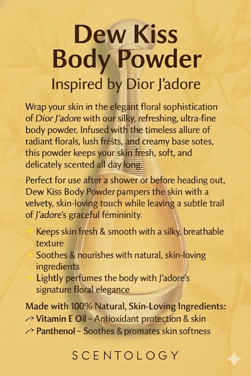 Perfect for use after a shower or before heading out, Dew Kiss Body Powder indulges your senses in the luxury and timeless femininity of J’adore — in a skin-loving, pampering form.