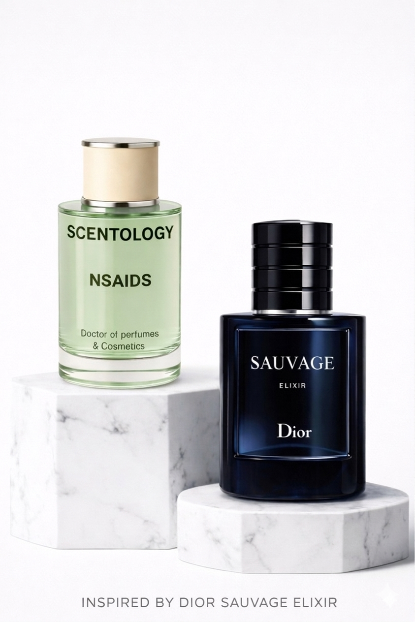 Experience the deep intensity of NSAIDS by Scentology, a powerful masculine fragrance inspired by Sauvage Elixir by Dior.